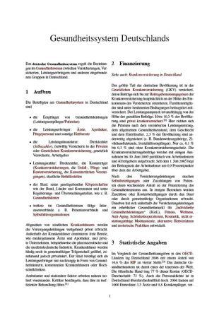 Im Prinzip basiert es auf drei Leistungspartnern: Den Empfängern, den Erbringern und den Finanzierern. Die Empfänger sind als Patienten zwangsversichert und erhalten im Krankheitsfalle die Leistungen bezahlt. Dazu gehören ambulante medizinische Versorgung, Laborleistungen, Krankenhausbehandlung, Medikamente und Rehabilitationsmassnahmen. Erbracht werden die Leistungen neben Ärzten, Krankenschwestern, Apothekern, Krankengymnasten und Psychotherapeuten von einer Vielzahl von Berufsgruppen. Die meisten der 2100 Krankenhäuser sind Teil der öffentlichen Gesundheitsversorgung. Etwas mehr als 1 Millionen Erwerbstätige arbeiten in Krankenhäusern. Insgesamt arbeiten etwa 10% der deutschen Beschäftigten im Gesundheitssystem.